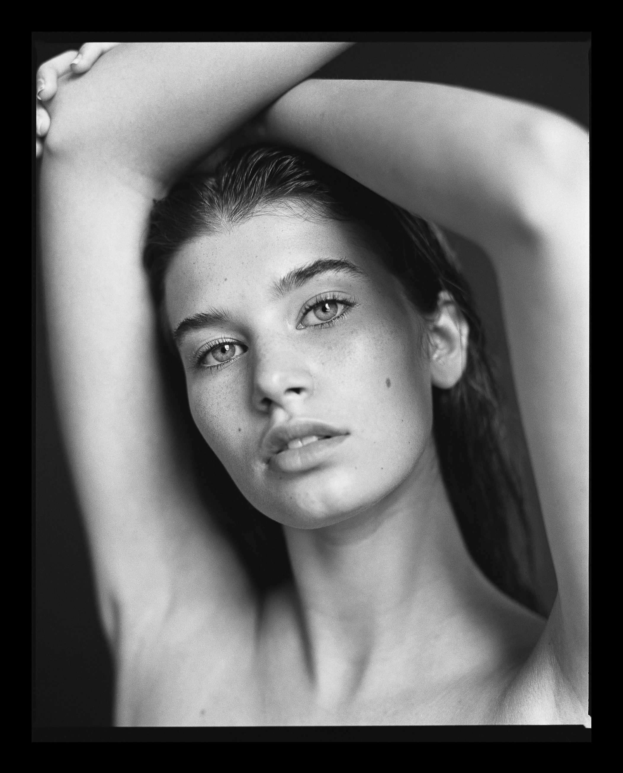 A black and white close-up portrait of a woman with her arms raised above her head, looking directly at the camera, with clear skin, light-colored eyes, and dark hair.