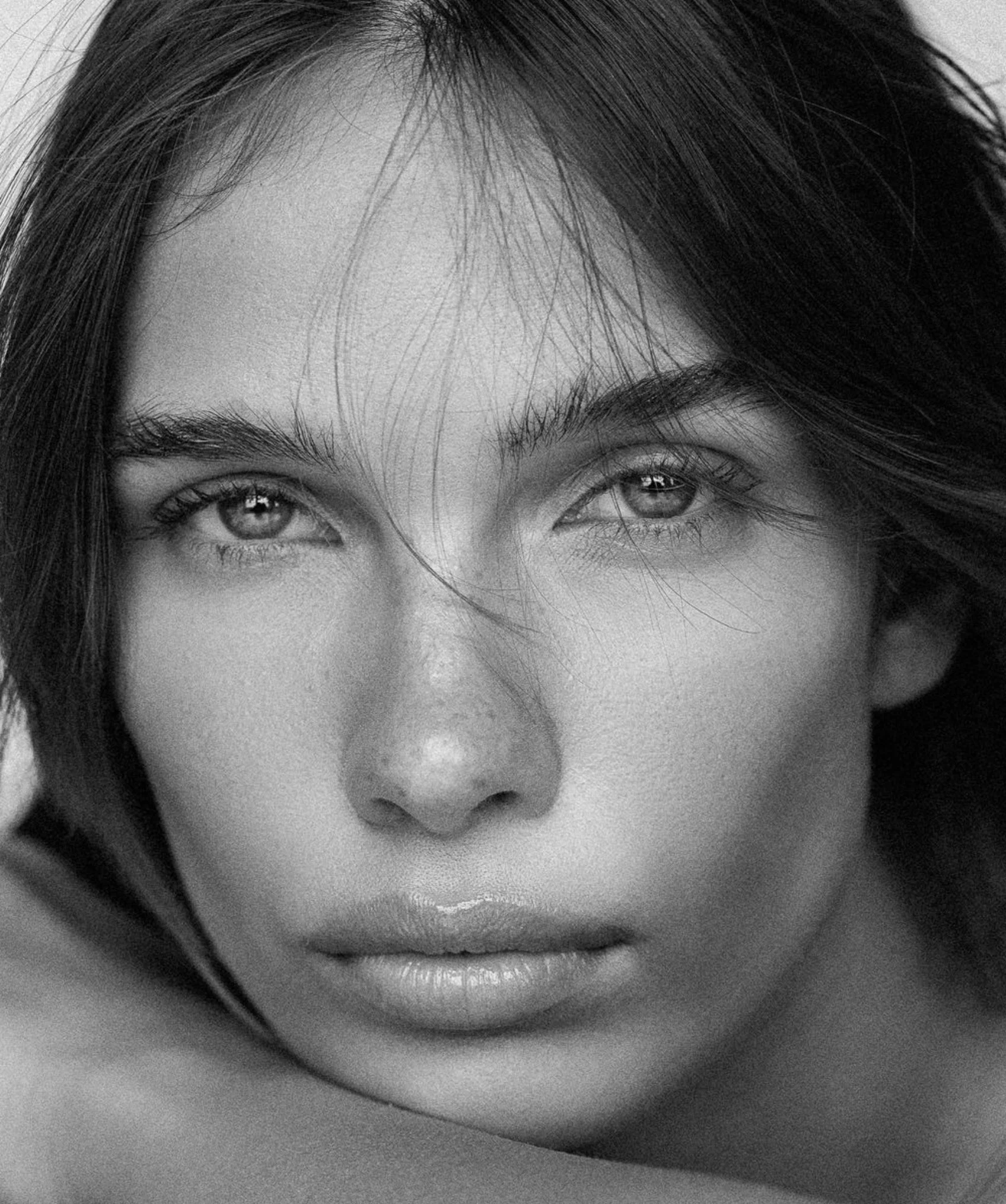 Close-up black and white portrait of a young woman with dark hair and intense eyes. View fullsize